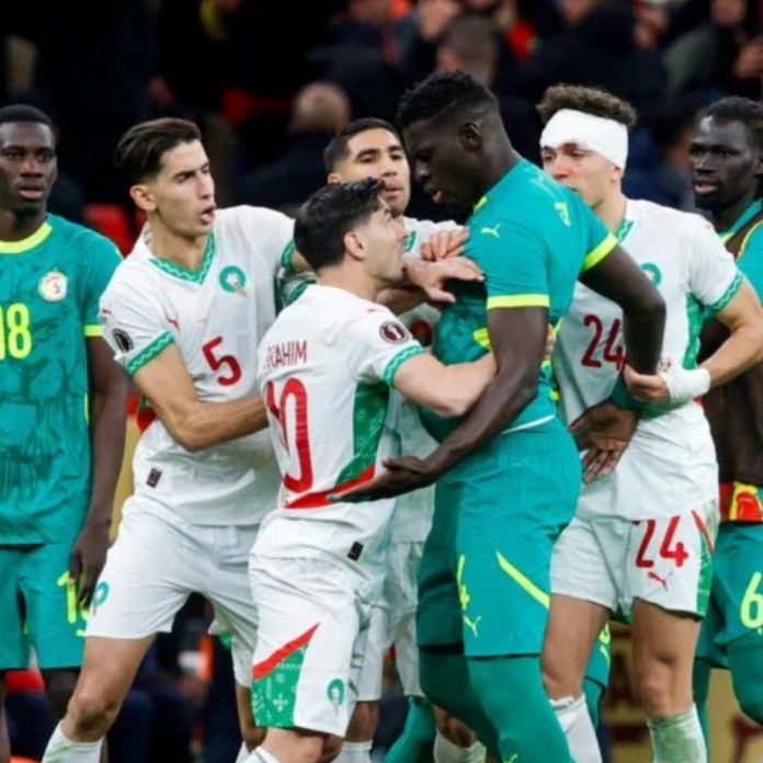 Senegal and Morocco players clash during the Africa Cup of Nations (CAN) final football match between Senegal and Morocco at the Prince Moulay Abdellah Stadium in Rabat on January 18, 2026. (Photo by Abdel Majid BZIOUAT / AFP)