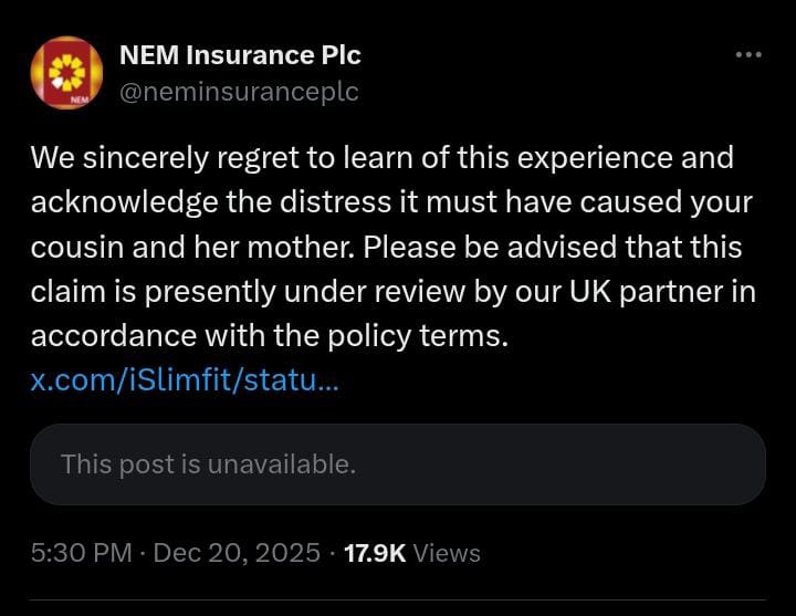 The family reportedly reached out multiple times to senior NEM officials, including Wunmi Olatunbosun, Daniel Okuchemiya, Julius Elusakin, Wasiu Osunbiyi, and even the company’s chairman, Tope Smart, but received no response. The lack of communication has forced them to take their complaints public, highlighting frustrations many Nigerians have with insurers who fail to honor legitimate claims.