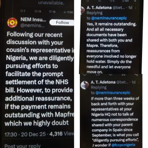 Efforts by NATIONAL WAVES to make NEM Insurance react to the allegations were unsuccessful as it was yet to react to our enquiries as at press time but NATIONAL WAVES got the insurance company’s response via its X handle. While reacting to the development, NEC Insurance via its X handle stated “Following our recent discussion with your cousin’s representative in Nigeria, we are diligently pursuing efforts to facilitate the prompt settlement of the NHS bill. However, to provide additional reassurance, if the payment remains outstanding with Mapfre—which we highly doubt,