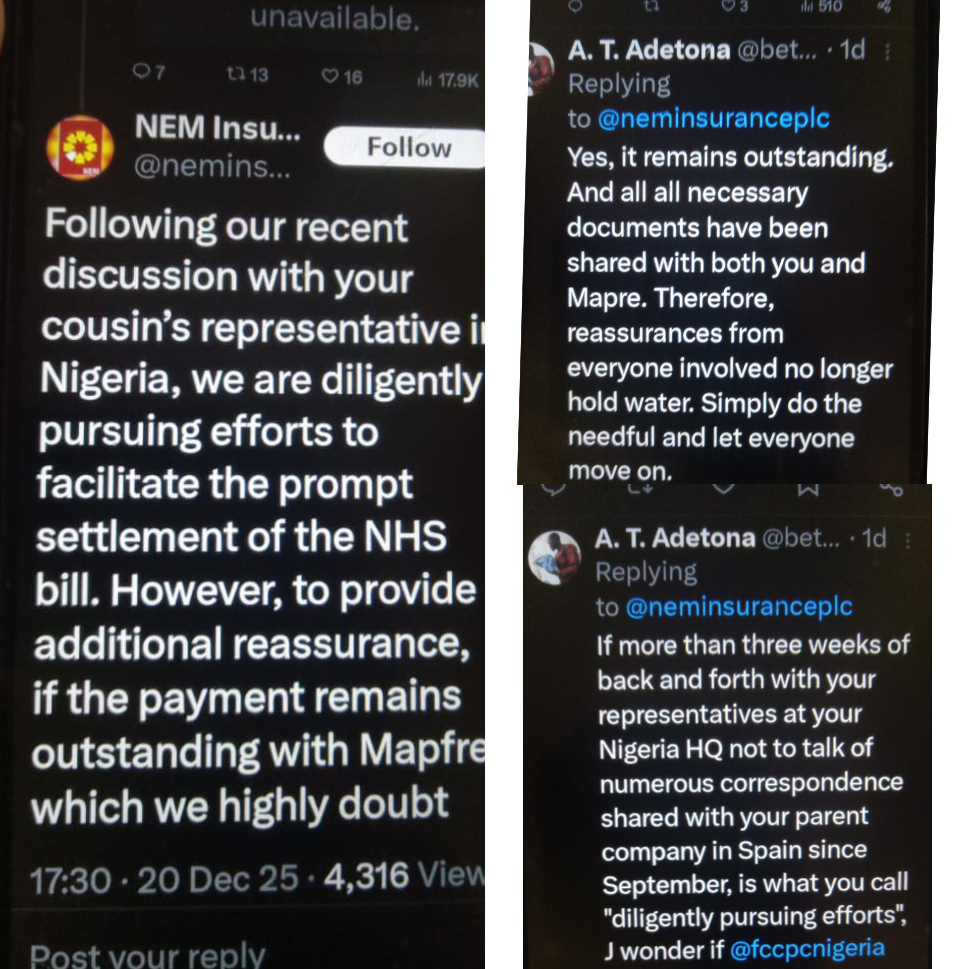 In response, a cousin to the customer, AT Adetona replied “If more than three weeks of back and forth with your representatives at your Nigeria HQ not to talk of numerous correspondence shared with your parent company in Spain since September, is what you call “diligently pursuing efforts”, I wonder if @fccpcnigeria would agree with you