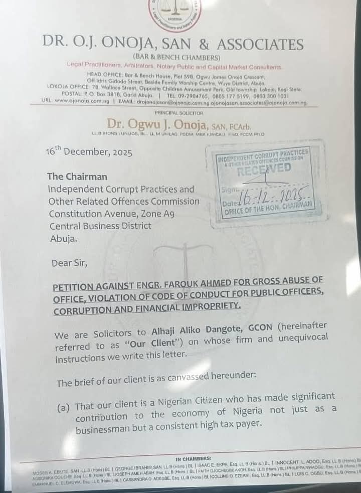The Chairman of Dangote Industries Limited, Alhaji Aliko Dangote has petitioned the Independent Corrupt Practices and other Related Offences Commission (ICPC), seeking an investigation into alleged corruption and financial impropriety by the managing director of the Nigerian Midstream and Downstream Petroleum Regulatory Authority (NMDPRA), Farouk Ahmed.