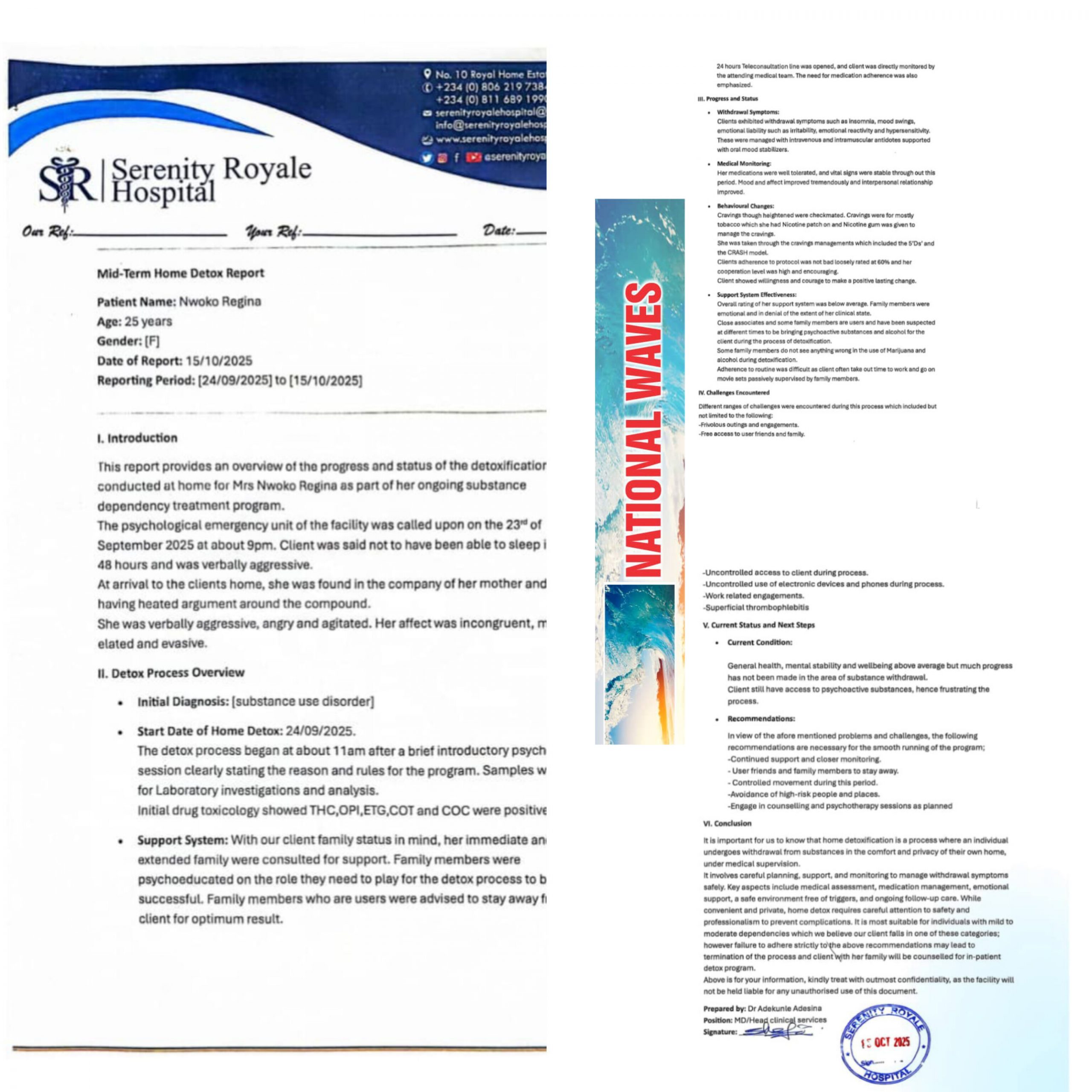 Documents exclusively obtained by NATIONAL WAVES indicate that Regina Daniels, the estranged wife of billionaire lawmaker, Senator Ned Nwoko, is excessively abusing drugs such as marijuana, cocaine and alcohol,