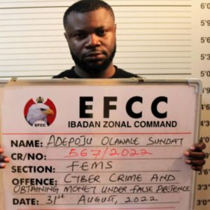 The statement reads in part, “The EFCC, Ibadan Zonal Command on Wednesday, March 29, 2023, arraigned the owner of Ibadan-based Club, De Rock Club, Adepoju Olawale Sunday alias SSG before Justice Uche Agomoh of the Federal High Court sitting in Ibadan, Oyo State on two separate charges for his alleged involvement in cybercrime, and obtaining money under false pretence to the tune of N31,821,000.00 (Thirty-One Million, Eight Hundred and Twenty-One Thousand Naira).