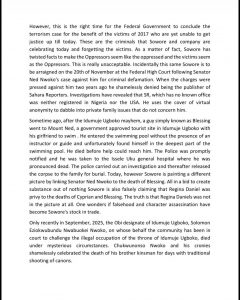 “This is the right time for the Federal Government to conclude the terrorism case for the benefit of the 2017 victims who have yet to receive justice. These are the criminals whom Sowore and his associates are celebrating today while ignoring the victims. Sowore has twisted facts to portray the oppressors as the oppressed and the victims as aggressors, an unacceptable inversion of reality. Incidentally, the same Sowore is scheduled for arraignment on November 20 at the Federal High Court in a criminal defamation case filed by Senator Ned Nwoko. When charges were first pressed two years ago, Sowore shamelessly denied being the publisher of Sahara Reporters. Investigations revealed that SR, which has no known office, is registered neither in Nigeria nor in the USA. He hides under a cloak of anonymity to intrude into private family issues that do not concern him.