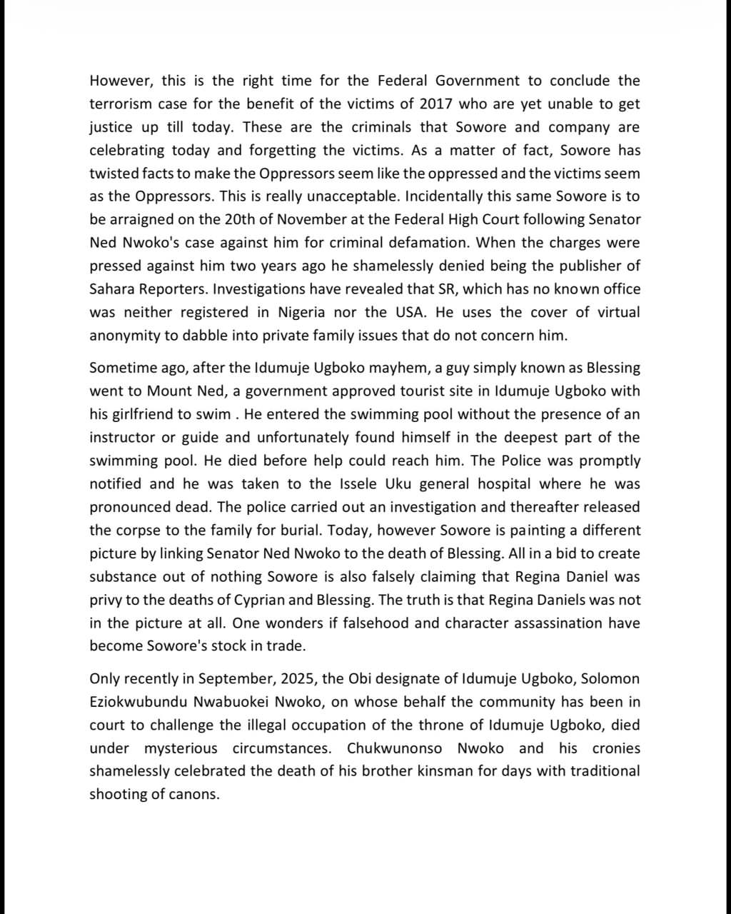 “Some time ago, after the Idumuje-Ugboko mayhem, a young man known as Blessing visited Mount Ned, a government-approved tourist site, with his girlfriend. He entered the swimming pool without an instructor or guide and, unfortunately, drifted into the deepest part of the pool. He died before help arrived. Police were promptly notified, and he was taken to the Issele-Uku General Hospital, where he was pronounced dead. After an investigation, the police released his body to the family for burial. Today, however, Sowore is falsely linking Senator Ned Nwoko to Blessing’s death. In the same vein, he is fabricating claims that Regina Daniels was privy to the deaths of Cyprian and Blessing. Regina Daniels was not in the picture at all. It is baffling how falsehood and character assassination have become Sowore’s stock-in-trade.