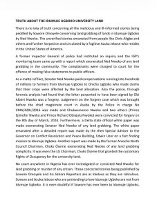 “Furthermore, a Delta State Government white paper exonerated Senator Nwoko after a detailed fact-finding mission led by the then Special Adviser on Conflict Resolution and Peace Building, Edwin Uzor. Former Aniocha North Council Chairman, Chuks Oseme, also issued a report clearing Nwoko of involvement in any land grabbing. It was Oseme who granted the Customary Right of Occupancy for the university land.