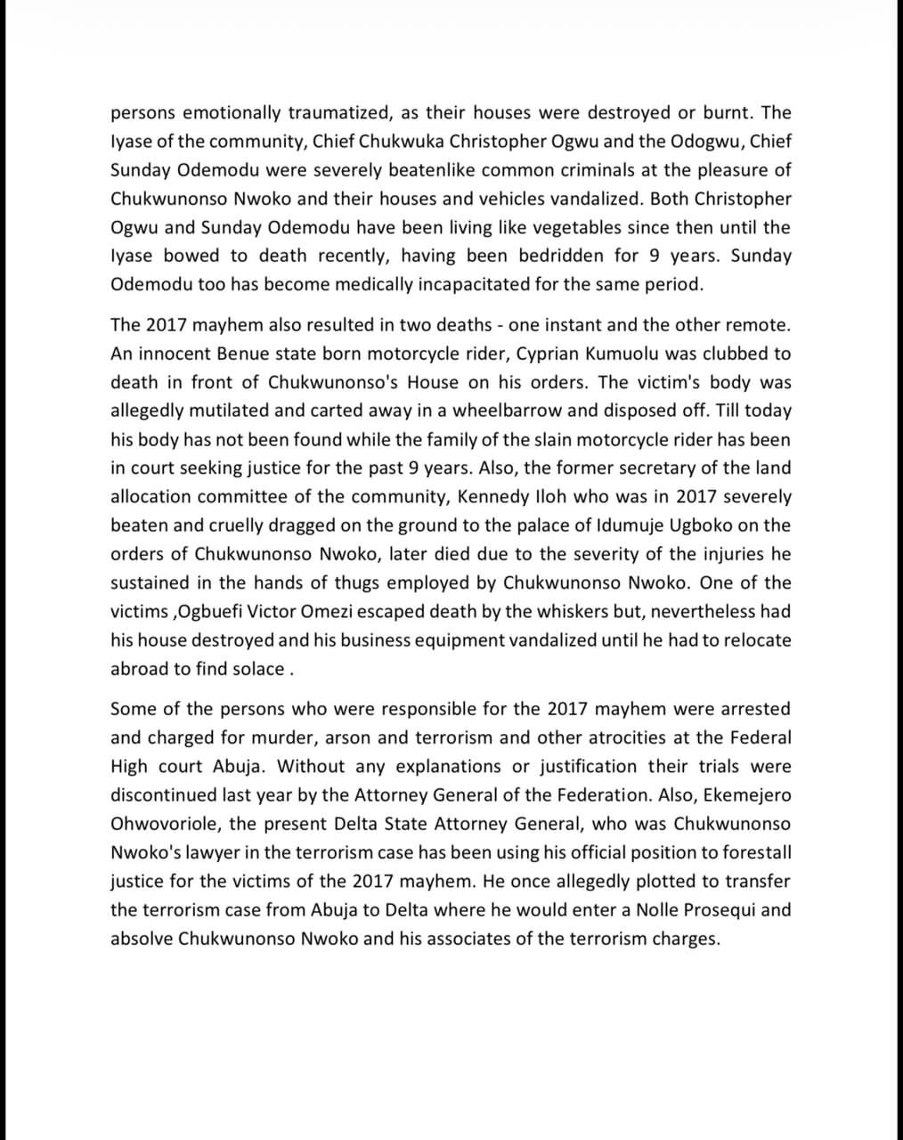He added in that “Some of the perpetrators of the mayhem were arrested and charged with murder, arson, terrorism, and other offences at the Federal High Court, Abuja. However, without explanation, their trials were discontinued last year by the Attorney-General of the Federation. The current Delta State Attorney-General, Ekemejero Ohwovoriole, who served as Chukwunonso’s lawyer in the terrorism case, has allegedly used his office to obstruct justice. At one point, he reportedly attempted to transfer the case from Abuja to Delta State in order to enter a nolle prosequi and absolve the accused.