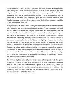 “Senator Nwoko once sued Sowore, who was unable to prove his wild allegations. The renewed attacks suggest that Sowore might have been hired by Nwoko’s political opponents to tarnish his reputation. Yet, like a cat with nine lives, Senator Nwoko has consistently emerged untainted, with no court ever convicting him of wrongdoing.