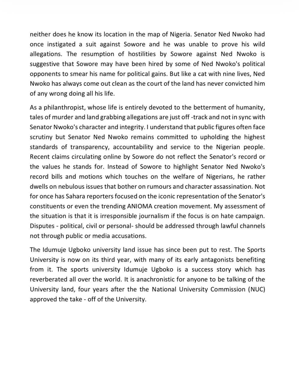 “As a philanthropist devoted to humanitarian service, allegations of murder and land grabbing are completely inconsistent with Senator Nwoko’s character and integrity. While public figures are subject to scrutiny, recent claims by Sowore do not reflect Nwoko’s record or values. Instead of highlighting the Senator’s impactful bills and motions, Sahara Reporters prefers to dwell on rumours and character assassination.