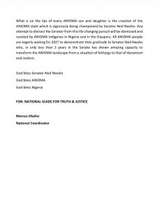 “What is on the lips of every ANIOMA son and daughter today is the creation of ANIOMA State, vigorously championed by Senator Ned Nwoko. Any attempt to distract him from this life-changing pursuit will be resisted by ANIOMA indigenes at home and in the diaspora. All ANIOMA people eagerly await 2027 to demonstrate their gratitude to Senator Nwoko, who, in less than three years in the Senate, has shown a remarkable capacity to transform the ANIOMA landscape from lethargy to dynamism and progress.”