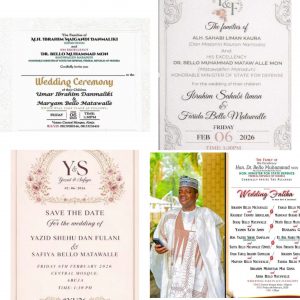 Separate invitation cards further revealed the identities of some of the couples. Hon. Nasiru Mu’azu Magarya, former Speaker of the Zamfara State House of Assembly, is set to marry Nana Bello Matawalle. Ibrahim Sahabi Liman will wed Farida Bello Matawalle, while Yazid Shehu Dan Fulani is to take Safiya Bello Matawalle as his bride. Umar Ibrahim Danmaliki is also scheduled to marry Aisha Bello Matawalle.