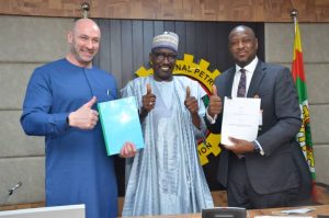 From Left Vice President, Sub Saharan Africa Region of Tecnimont SpA, Davide Pelizzolam, GMD, NNPC, Mallam Mele Kyari and Engr. Ahmed Dikko, MD, Port Harcourt Refining Company at the signing ceremony of $1.5billion PHRC Rehabilitation project
