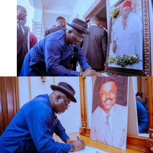 Governor Sheriff Oborevwori signing condolence registers of Senator Peter Nwaoboshi, and Chief Emmanuel Nuel Ojei