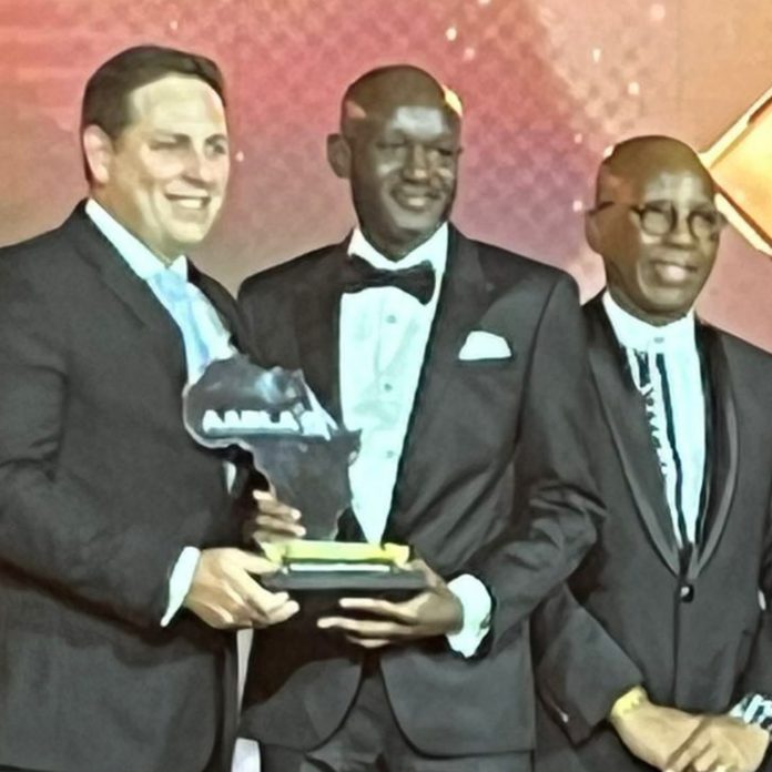 L-R: Head of Private Clients, SASFIN Wealth, South Africa, Flynn Robson; Chief Financial Officer, Zenith Bank Plc, Dr. Mukhtar Adam; and Chairman, BSG, South Africa, Mteto Nyati during the presentation of the CFO of the Year Award to Dr. Mukhtar Adam at the 11th All Africa Business Leaders Awards (AABLA) in partnership with CNBC Africa, held at the King’s Ballroom, Sun City, South Africa at the weekend.